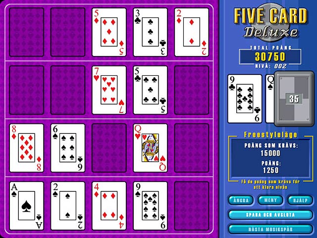 Ta fram ditt bästa pokeransikte och spela kort hela dagen lång. Ett par, två par, triss eller stege – allt är möjligt i Five Card Deluxe. Fyra olika spellägen gör detta kortspel till en sann pokerdröm. Du kan spara ditt spel och fortsätta när du har lust. Nu är det din tur att bli pokermästare!